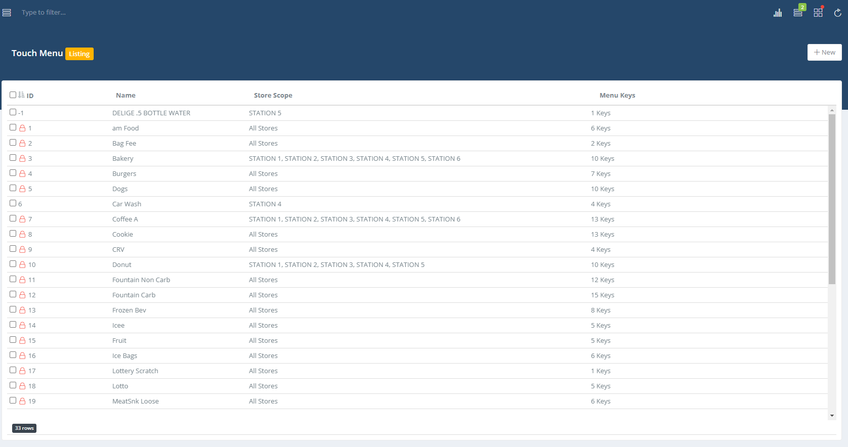 Touch Menus created at the local level are called site use keys and can be edited. A total of 6 Site Use Menu keys are available at store level with a maximum of 16 keys per menu.